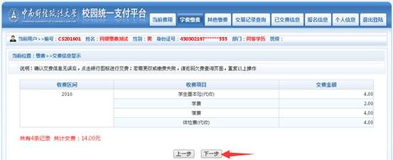 四、点“下一步”进入以下画面,显示本次你所选择缴费项目,不需要修改的话直接点下一步