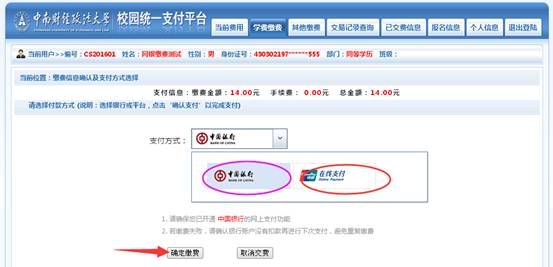 五、支付通道选择界面,根据自己的银行卡选择“中国银行”,或者“银联在线”支付,点击“确定缴费”,系统根据选择项分别跳转到不同的银行界面进行缴费操作。