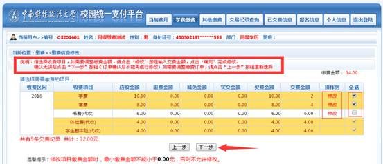 注:有助学贷款的学生根据自己的贷款金额选择缴费项目(体检费必交,学生基本险是武汉市大学生医疗保险,不缴费就视同不参保,如本年度发生医疗费用,不能享受医保报销),在所交费项目中修改实际缴费金额,具体操作请查看该红框中的红色说明文字。