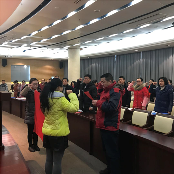 活动第一项议程,全体党员面对党旗举起右手,在龚和平同志带领下重温入党誓词,支部施英、黄川、周荣、王章莉、汤蓓蓓、尹红军同志诵读新修订党章总纲。
