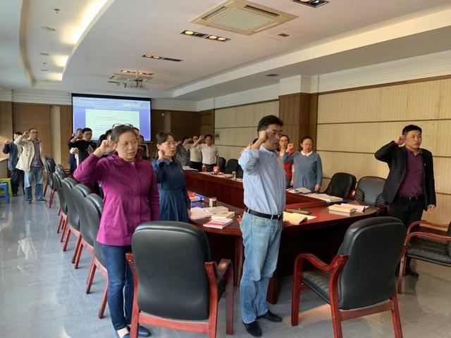 活动第一项议程,全体党员面对党旗举起右手,在张宝莲同志带领下重温入党誓词,支部王章莉、尹红军同志带领党员集体诵读党章。