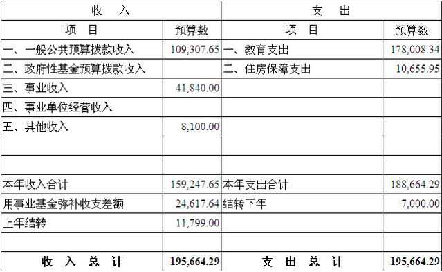 我校2019年预算收入195,664.29万元,比上年增加35,945.26万元,其中:上年结转11,799.00万元,占总收入的6.03%;一般公共预算拨款收入109,307.65万元,占总收入的55.87%;事业收入41,840.00万元,占总收入的21.38%;其他收入8,100.00万元,占总收入的4.14%;用事业基金弥补收支差额24,617.64万元,占总收入的12.58%。