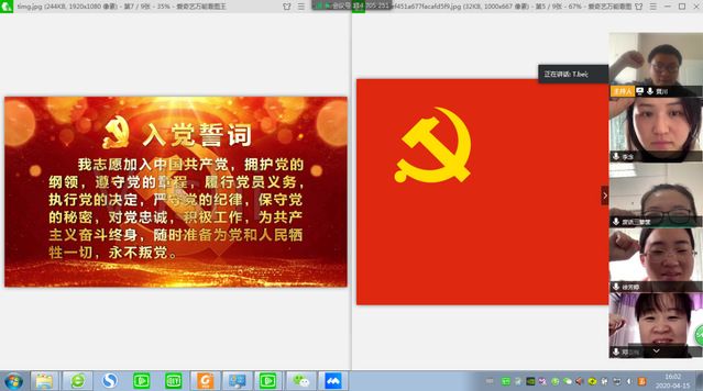 本次主题党日活动分为重温入党誓词、政治理论学习、党员学习讨论三个环节。重温入党誓词环节,全体党员起立,面对屏幕上鲜红党旗,庄严举起右拳。在夏灵同志领读下,以铿锵有力的声音向党旗宣誓,重温对党忠诚的铮铮誓言,表达了“不忘初心、牢记使命”的信念和决心。政治理论学习环节,全体党员原原本本、原汁原味地学习了习近平总书记关于总体国家安全观的重要论述、习近平总书记关于统筹抓好疫情防控和经济社会发展的重要讲话精神和爱国主义教育实施纲要。党员学习讨论环节,各位党员对如何在统筹抓好疫情防控和复工复学工作中,充分发挥党支部战斗堡垒作用和党员的先锋模范作用,开展了热情洋溢的学习发言。袁伟同志分享党员们的抗疫故事,对他们在防疫战场上争做先锋、勇当表率的模范带头作用表达了强烈赞许。童颖同志认为这场新冠肺炎疫情让她深刻体会到党和国家全心全意为人民服务、立党为公、执政为民的执政理念。龚和平同志对报账大厅改造、219党员活动室改造、两校区温控设施安装进展以及2021年改善办学条件项目申请与审核情况进行了详细介绍。
