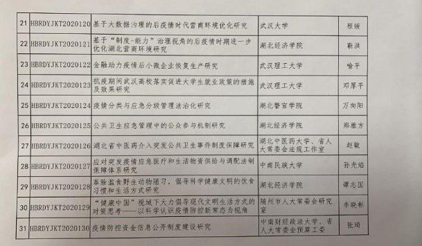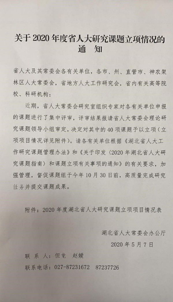 在此基础上,课题小组还不断结合疫情期间防控资金物资信息公开的实际情况,继续展开调研,并积极向湖北省人民代表大会常务委员会献言献策。5月7日,会计核算中心支出分中心主任李念执笔的《疫情防控资金信息公开制度建设研究》获得2020年度湖北省人大研究课题立项,并由中南财经政法大学财务部与湖北省人大预工委联合开展研究。消息传来,大家感到了极大的振奋和鼓舞。这既是对大家研究的肯定,也是一种鞭策。课题组成员们纷纷表示,将继续做好本职工作,充分发挥业务优势,努力开展科研攻关,为战胜疫情提供更多、更好的科研“金点子”!