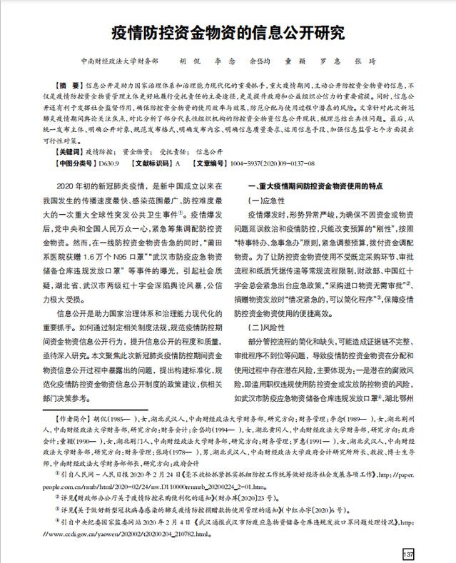 聚焦本次新冠肺炎疫情防控期间资金物资信息公开过程中暴露出的问题,科研小组深入调研,通过详细梳理疫情期间各级政府及慈善机构的物资、资金信息公开情况,提炼出《重大疫情期间防控资金信息公开的建议》,于3月6日在学校官微“中南大微校园”上发表。在此基础上,课题组继续从抗疫实录中汲取宝贵的智慧与力量,挖掘总结深层规律,预算管理办公室主任胡侃作为第一署名人撰写了科研论文《疫情防控资金物资的信息公开研究》,5月11日在核心期刊《会计之友》2020年第9期上发表。文章结合“武汉市红十字会捐赠公告”等多个实际案例,深入探讨了重大疫情期间防控资金物资使用的特点、疫情防控资金物资信息公开的意义、现状及主要问题,继而提出:构建标准化、规范化疫情防控资金物资信息公开制度,统一发布主体、明确公开对象、规范发布格式、确定发布内容、提高信息质量、运用信息手段、加强信息监督等七项政策建议,供相关部门决策参考。