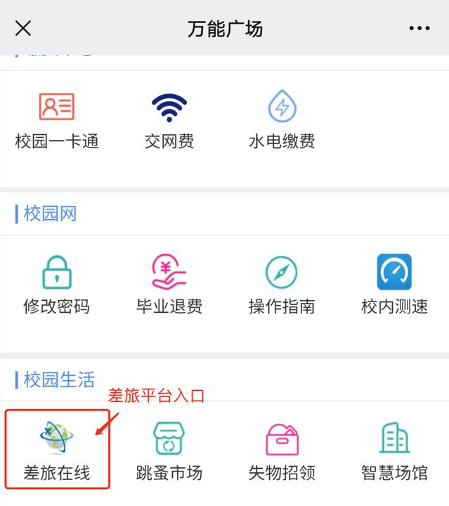 教职工可通过微信“中南大微校园”-“万能广场”-“差旅在线”快速登录差旅平台系统。