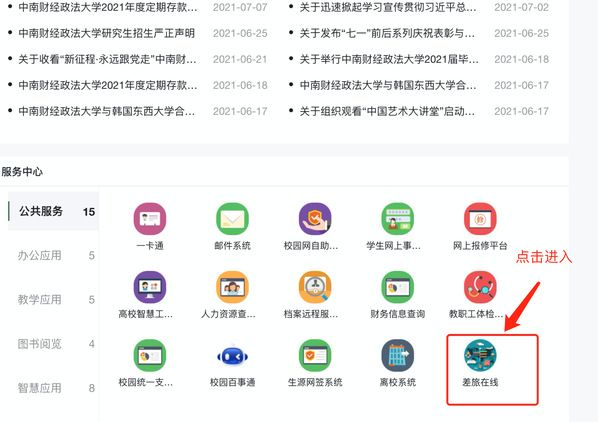 1.通过校园网主页“信息门户”登录,选择“公共服务”中“差旅在线”快速登录差旅平台系统。