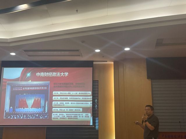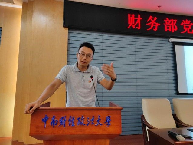 会上财务部副部长袁伟同志以《中南财经政法大学简明校史》为题讲授专题党课。他从学校的发展的六个历史时期,详细介绍了学校在艰辛中成立、在竞争中成长、在改革中发展、在创新中奋进的办学历程。并鼓励大家继续弘扬优良校风,勇担历史重任,努力拼搏奋斗,在新时代新征程中走好前进路。
