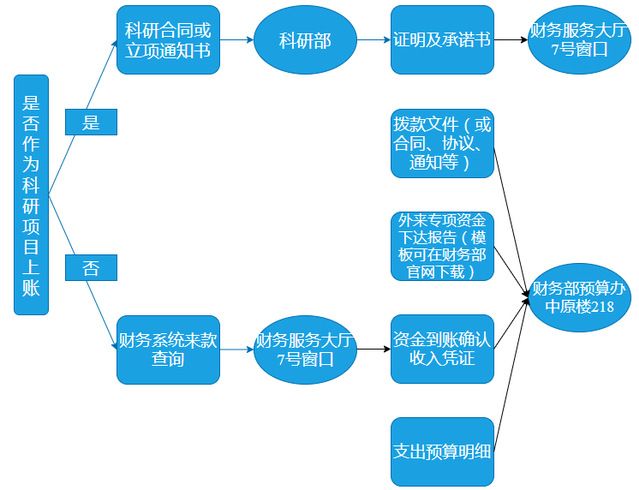 1.收到校外单位(不含上级主管部门)拨付的有限定用途的外来专项资金(非科研项目)时,视情况下达预算:其用途与现有校内预算项目重复的,不再重复安排预算;确系新增事项的,按上述流程图办理。