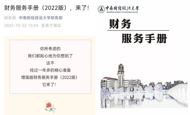 10月22日,通过财务部微信公众号发布2022年新版《财务服务手册》,为师生办理各项财务业务提供详细的操作指导,实现“一本在手,财务无忧”。