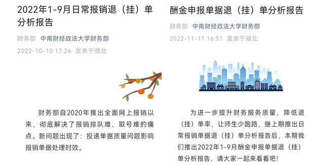 10月10日和11月11日,通过财务部微信公众号发布《日常报销退(挂)单分析报告》《酬金申报单据退(挂)单分析报告》,以降低退(挂)单率,让师生少跑路,提高报销单据处理时效,进一步提升财务服务效率。